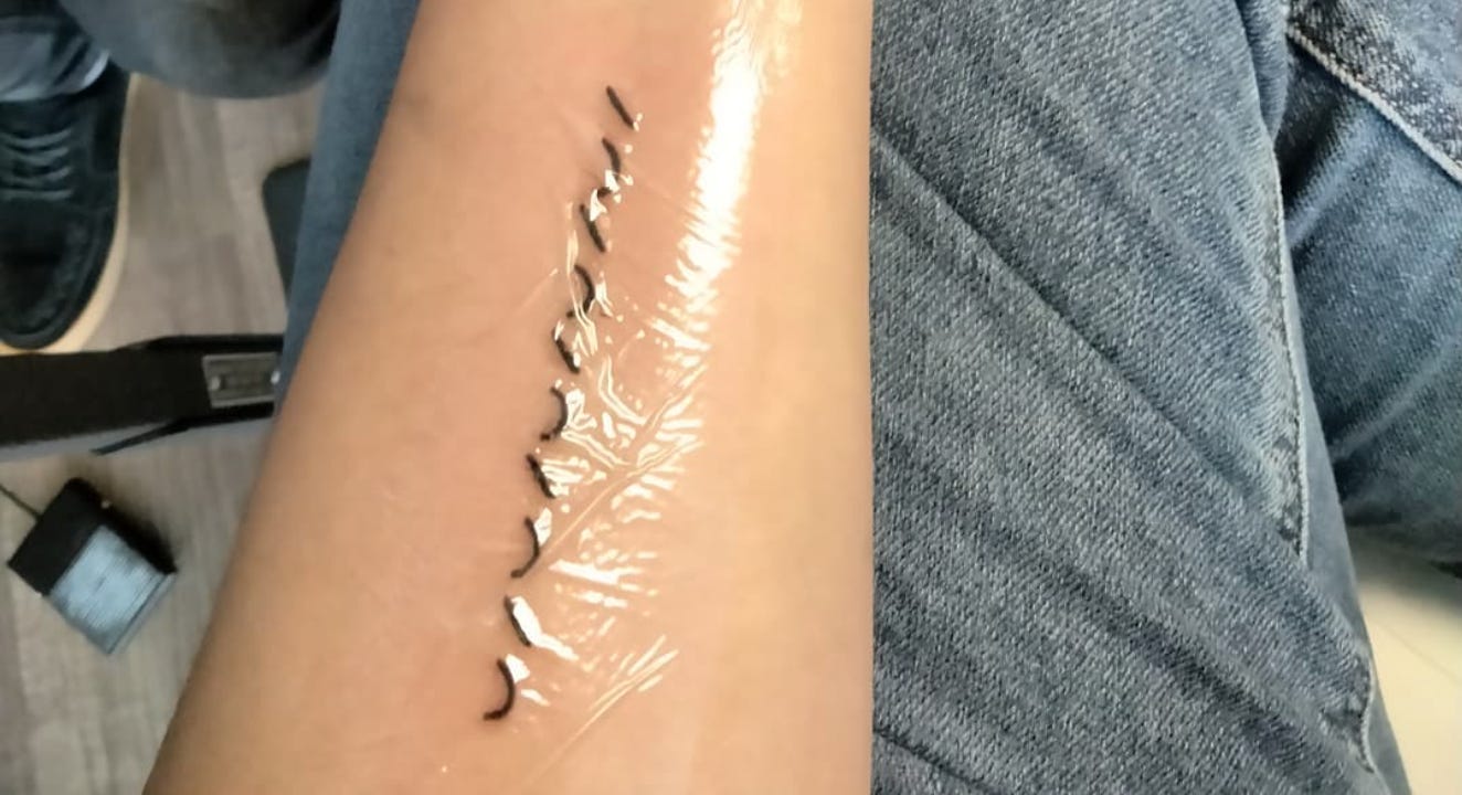 It’s a perfect line of iambic pentameter, expressed through the sanction symbols I learned growing up. Dashes for the stressed symbols, and little “U”s for the unstressed ones. I got it on my left arm facing me, so that theoretically, I could hold a script in my right hand and reference particularly tricky poetry by tapping out the symbols on my arm.